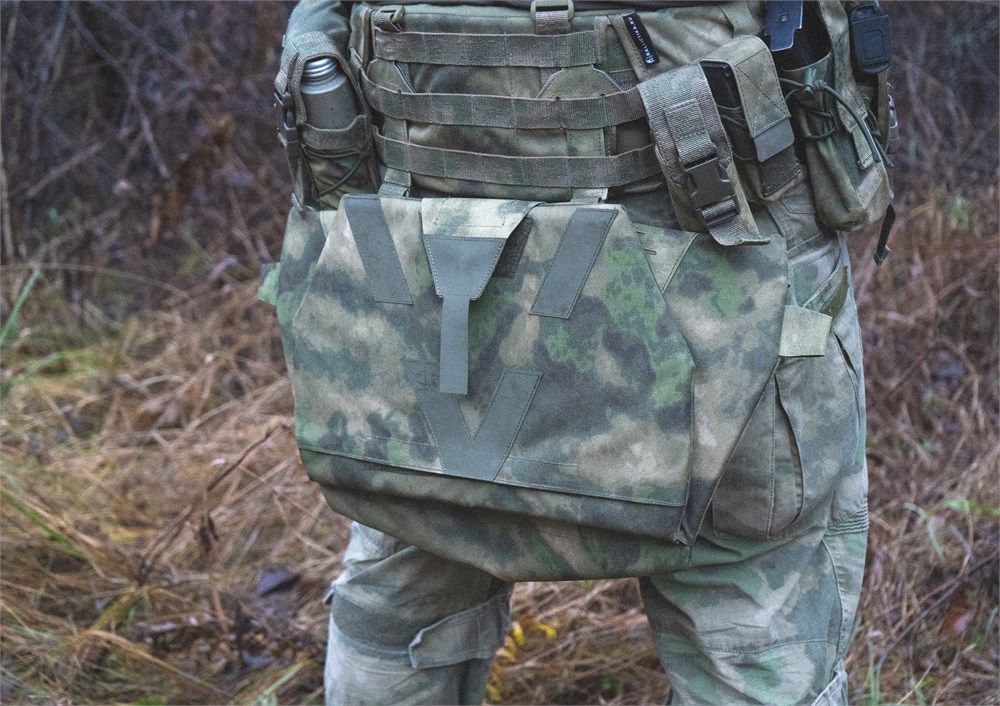 Двухсекционная сидушка для размещения одного или двух баллистических пакетов, защищающих поясницу, таз и ноги от осколков. Сидушка может быть закреплена тремя способами: на MOLLE-платформу бронежилета или пояса, а также как классическая сидушка с помощью поясной стропы. В этом случае её можно будет повернуть вперёд и использовать как малый коврик для засады либо подложить под спину для короткого отдыха.